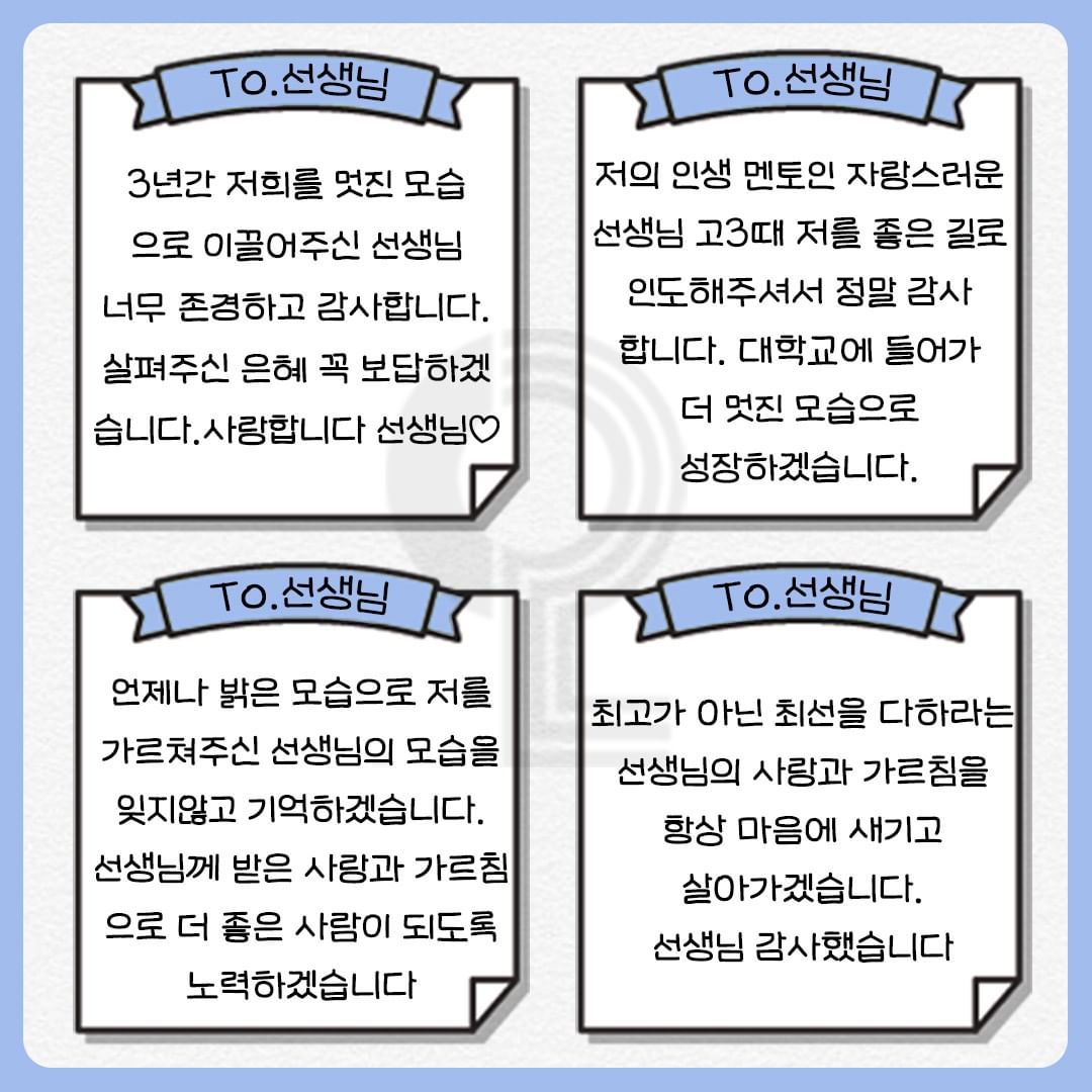 - 너무 힘들었던 고3 생활 동안 선생님께서 주신 사랑과 믿음 덕분에 미래를 포기하지 않고 도전 할 수 있었습니다. 사랑합니다 그리고 존경합니다.